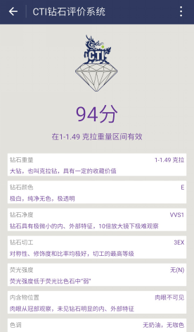 《钻石评分》企业标准是CTI珠宝实验室通过对国际钻石市场及亚洲消费者购买行为的分析研究,在钻石4C分级的基础上进行了观念和技术创新,结合了更多诸如:荧光强度、内含物的深浅及其位置,以及是否具有咖色、奶色等较大程度影响钻石品质和价值的因素,通过对其量化,并采用百分制模式直观评价钻石综合品质等级的技术方法。