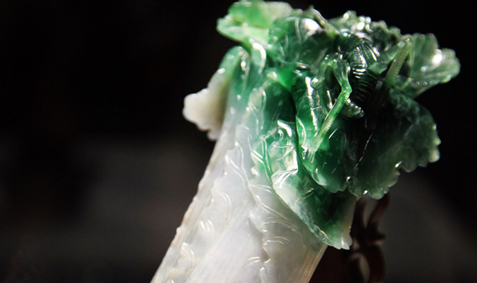 翠玉白菜与真实白菜相似度几乎为百分之百的作品,是由翠玉所琢碾而成,亲切的题材、洁白的菜身与翠绿的叶子,都让人感觉十分熟悉而亲近,别忘了看看菜叶上停留的两只昆虫,它们可是寓意多子多孙的螽斯和蝗虫。